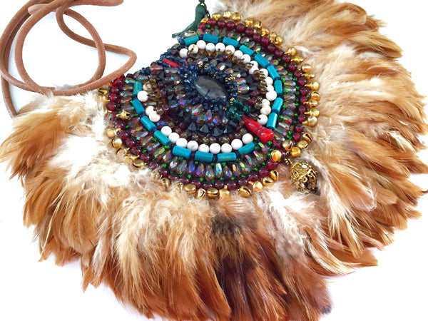 Step out and get noticed in this beautiful embellished, one of a kind, cross body bag. This stunning bag is intricately handcrafted from antique kilim carpet, wooden beads, vintage gold plated banjara tassel charm with Swarovski crystals and dangling glass beads, multifaceted crystal glass beads, glass beads, gold plated metal charm bells, resin beads, and feathers.