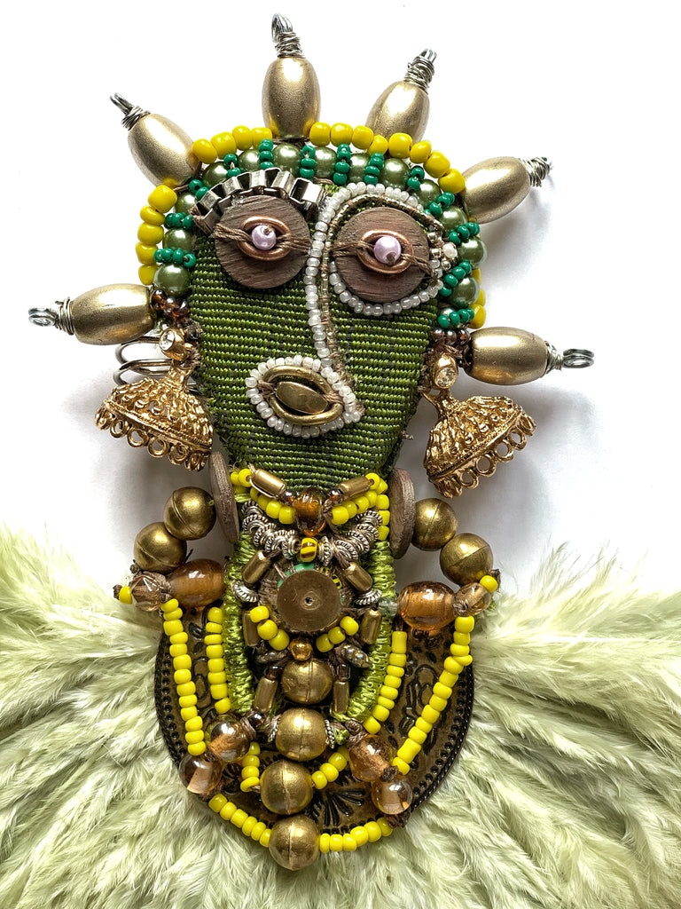 Emerald Ancestral Handcrafted Beaded & Feather Mask Brooch.