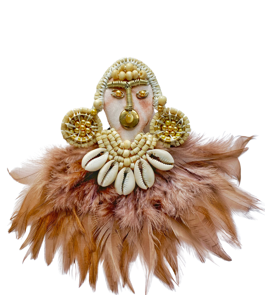 The oversized form, layered textures, and warm neutral tones create movement, depth, and undeniable visual power. Gold-toned beads, and metal accents elevate the design, while the cowrie shells long associated with luxury and status add striking contrast and cultural richness.