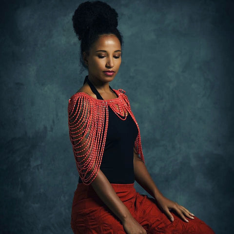 This neckpiece explores the rich African artistry and craftsmanship, and that of rich, powerful, aristocratic glamour and spectacle of the seventeenth century, characterised by high ruffled collars and bejewelled fabrics worn by Queen Elizabeth 1 of England.